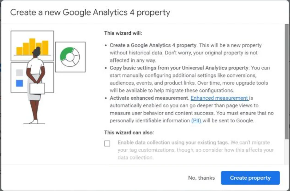 If you currently have a Universal Analytics property for your website, then set up of a Google Analytics 4 property can be completed with the GA4 Setup Assistant.