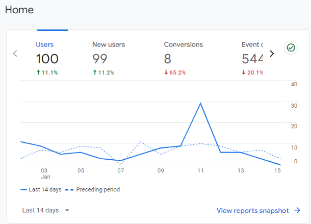 At the left menu, you can see Reports. Click on this, and you’ll be presented with your “Reports snapshot”