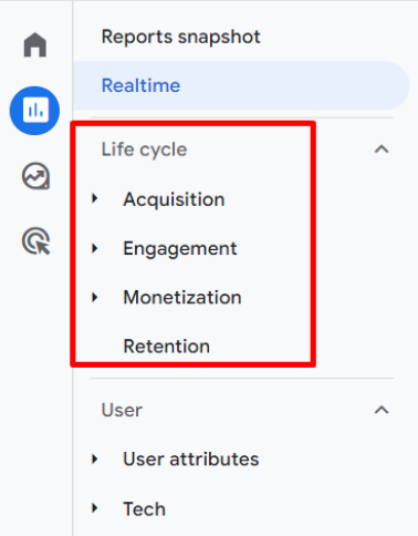 Under Lifecycle, you can see 4 main headings: Acquisition, Engagement, Monetization and Retention